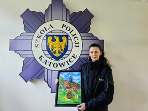 Słuchaczka szkolenia zawodowego podstawowego post. Karolina Kita namalowała obraz techniką akrylową pt. „Skok przez ogień”, który zostanie przekazany przez naszą szkołę na aukcję internetową prowadzoną przez Fundację „Salut” z siedzibą w Katowicach. Dochód z aukcji zostanie przeznaczony na leczenie i rehabilitację policjanta z Chorzowa, który w sierpniu ubiegłego roku uległ poważnemu wypadkowi podczas ratowania osób z płonącego budynku.