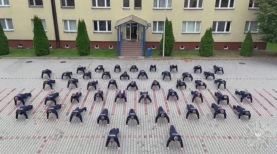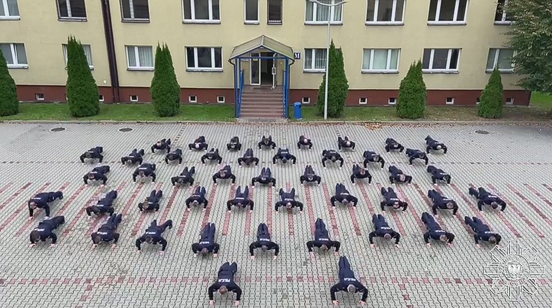 Opis filmu: Na filmie słuchacze i kadra szkoły wykonują pompki na placu między budynkami w ramach akcji Gaszyn Challenge