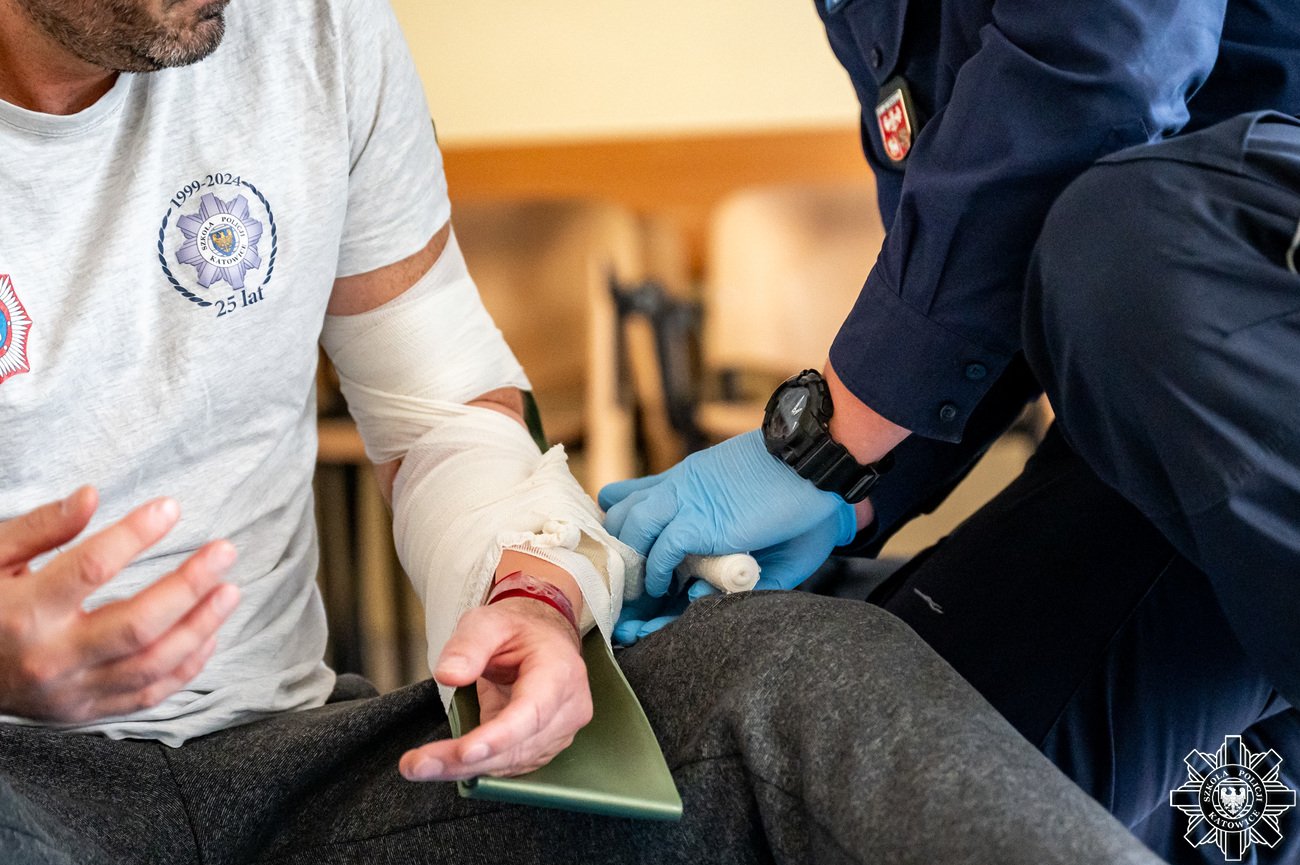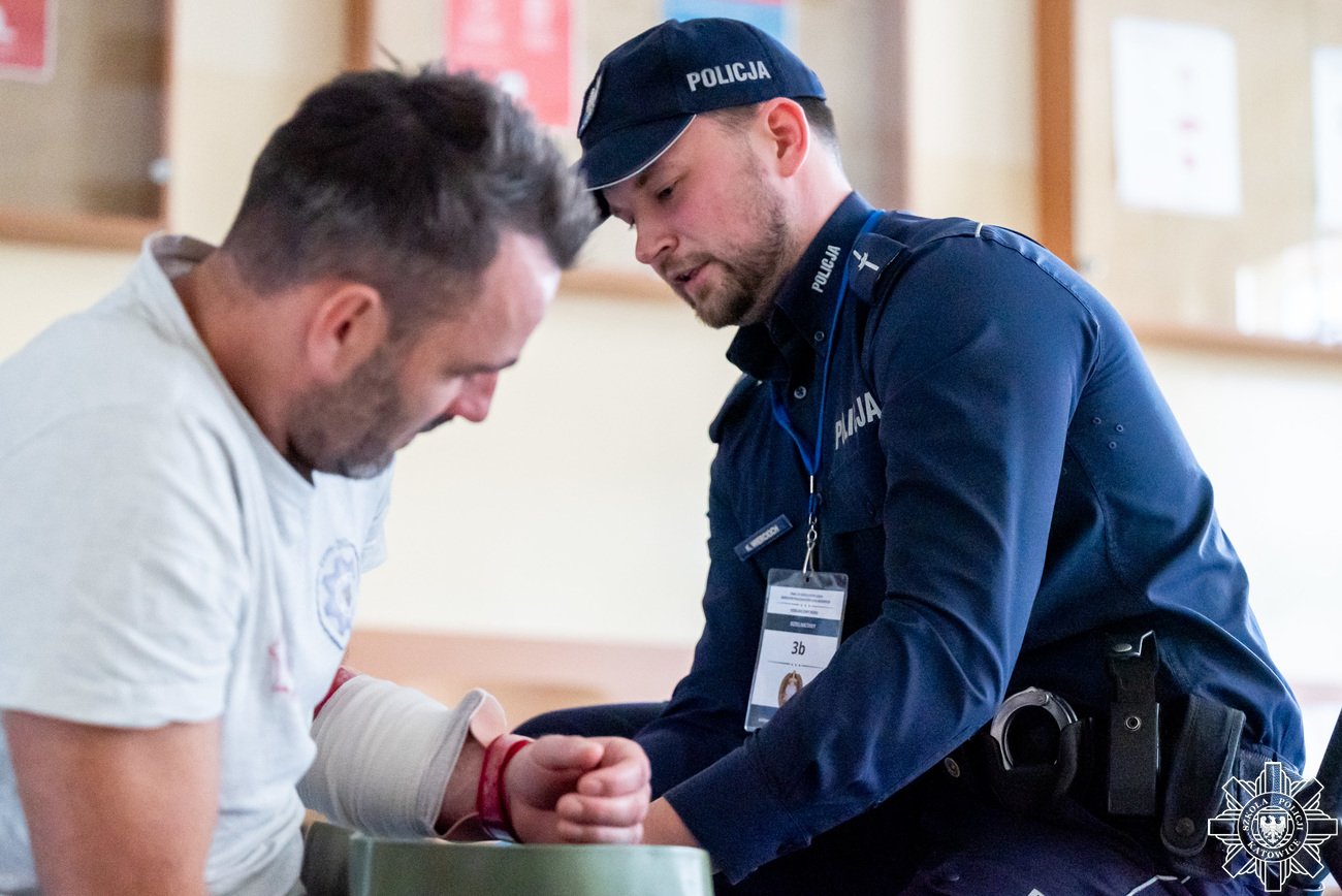 Druga konkurencja, z jaką przyszło zmierzyć się dzielnicowym, dotyczyła udzielania pierwszej pomocy. Jej celem była ocena praktycznych umiejętności w zakresie ratowania życia ludzkiego. Uczestnicy musieli prawidłowo ocenić sytuację, zabezpieczyć miejsce zdarzenia, sprawdzić funkcje życiowe poszkodowanego, a w razie potrzeby przeprowadzić resuscytację krążeniowo-oddechową (z użyciem fantomu).