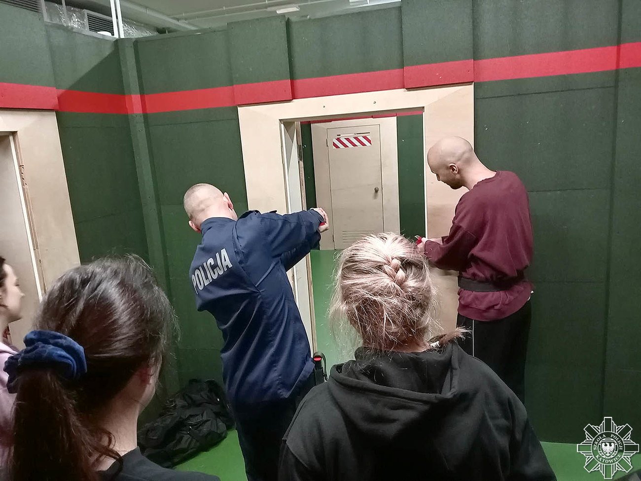 W trakcie zajęć wykładowcy szkoły przedstawili metodykę nauczania taktyki i technik interwencji oraz omówili praktyczne aspekty użycia broni palnej, kajdanek, pałki służbowej i tasera. Część teoretyczna obejmowała m.in. prezentację broni stosowanej przez Policję, zasady jej użycia oraz analizę czynników wpływających na zachowanie funkcjonariusza podczas interwencji. Zajęcia wzbogacono materiałem filmowym z rzeczywistych interwencji.