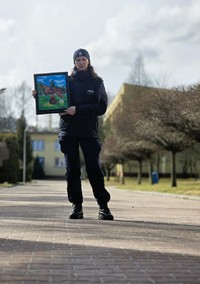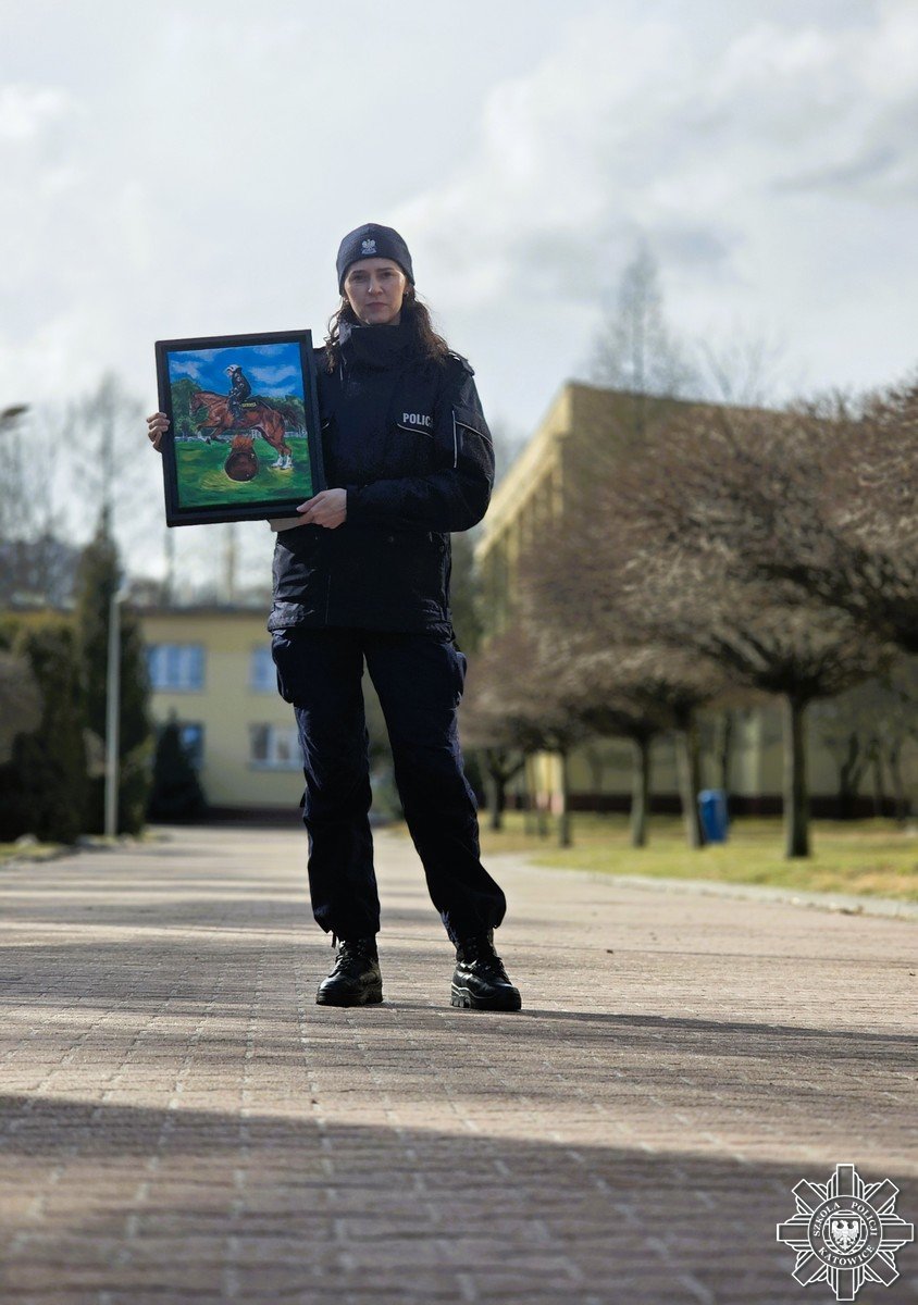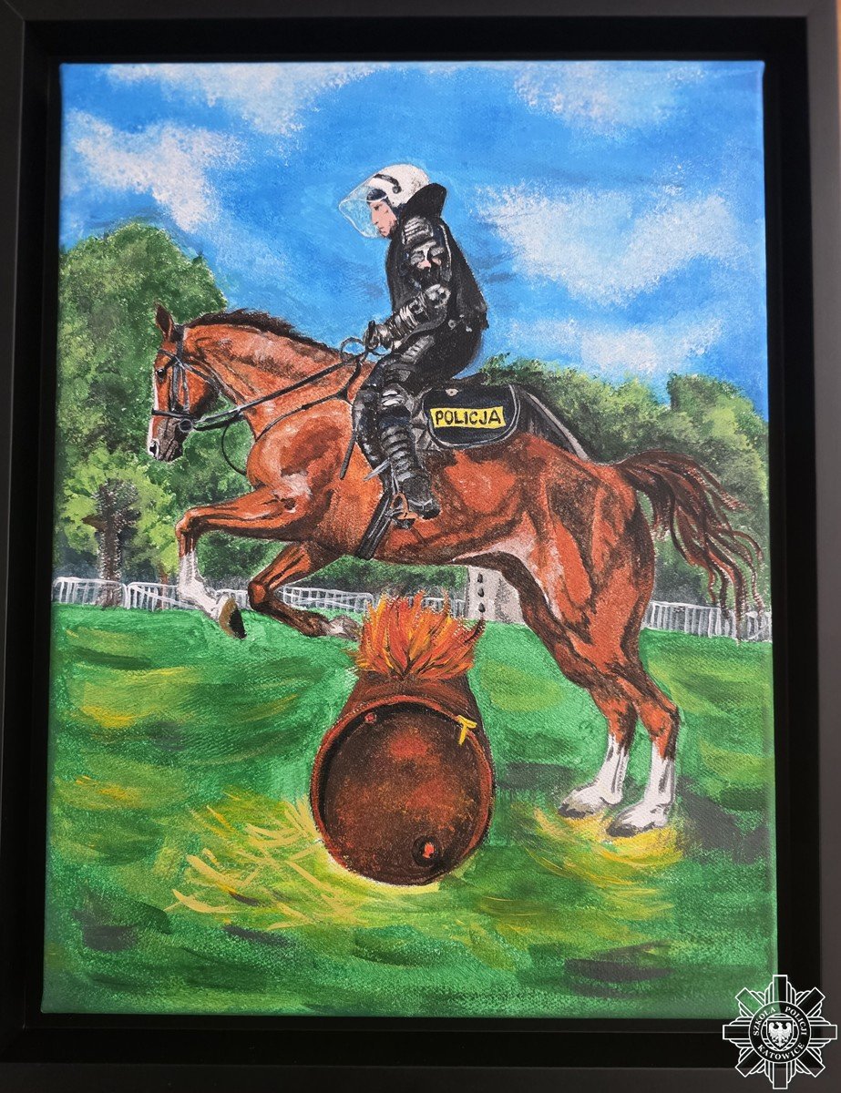 Słuchaczka szkolenia zawodowego podstawowego post. Karolina Kita namalowała obraz techniką akrylową pt. „Skok przez ogień”, który zostanie przekazany przez naszą szkołę na aukcję internetową prowadzoną przez Fundację „Salut” z siedzibą w Katowicach. Dochód z aukcji zostanie przeznaczony na leczenie i rehabilitację policjanta z Chorzowa, który w sierpniu ubiegłego roku uległ poważnemu wypadkowi podczas ratowania osób z płonącego budynku.