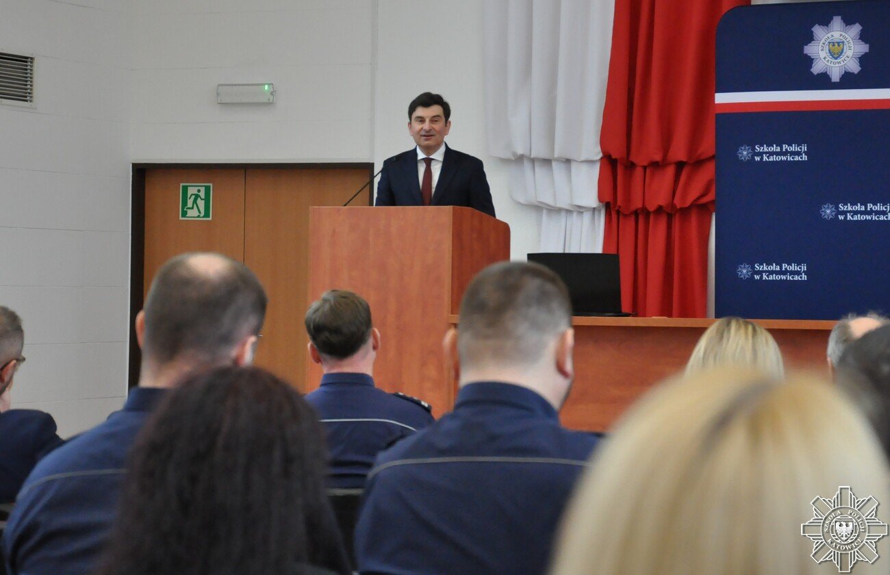 Następnie głos zabrali Wojewoda Śląski Marek Wójcik, Wiceprezydent Miasta Katowic Maciej Stachura oraz Komendant Wojewódzki Policji w Katowicach nadinsp. Mariusz Krzystyniak. W swoich wystąpieniach podkreślili dynamiczny rozwój Szkoły Policji w Katowicach, wskazując na jej istotną rolę w procesie kształcenia i przygotowania do służby młodych policjantów. Wyrazili również uznanie dla dotychczasowej współpracy oraz życzyli dalszych sukcesów w działalności dydaktycznej.