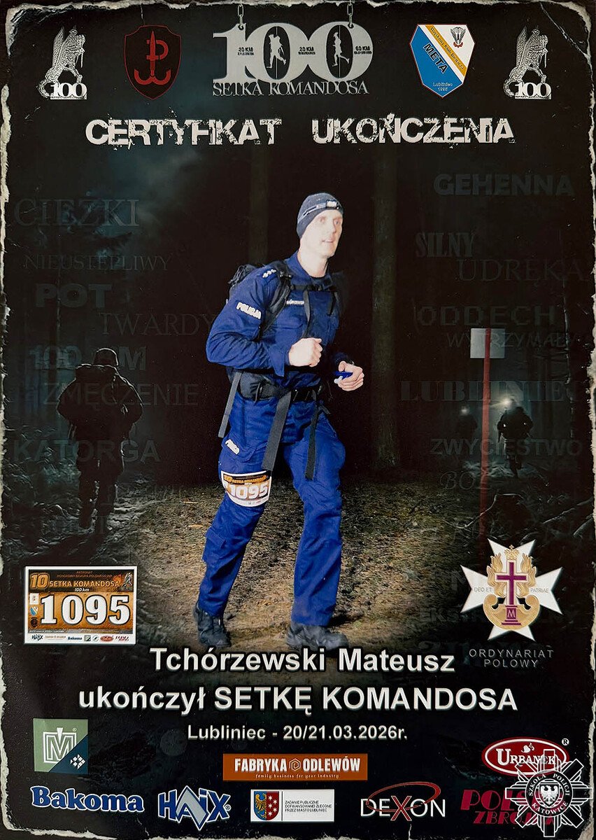 Starszy aspirant Mateusz Tchórzewski – instruktor Zakładu Prewencji i Ruchu Drogowego Szkoły Policji w Katowicach – z powodzeniem ukończył „Setkę Komandosa”. To ekstremalne wydarzenie sportowe zaliczane jest do prestiżowego cyklu biegów wojskowych „Wielki Szlem Komandosa” i od lat przyciąga najbardziej wytrzymałych zawodników z całej Polski.