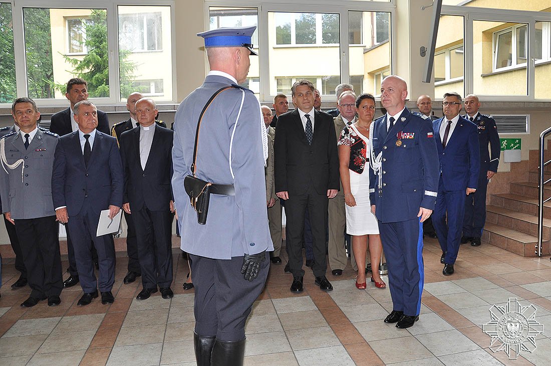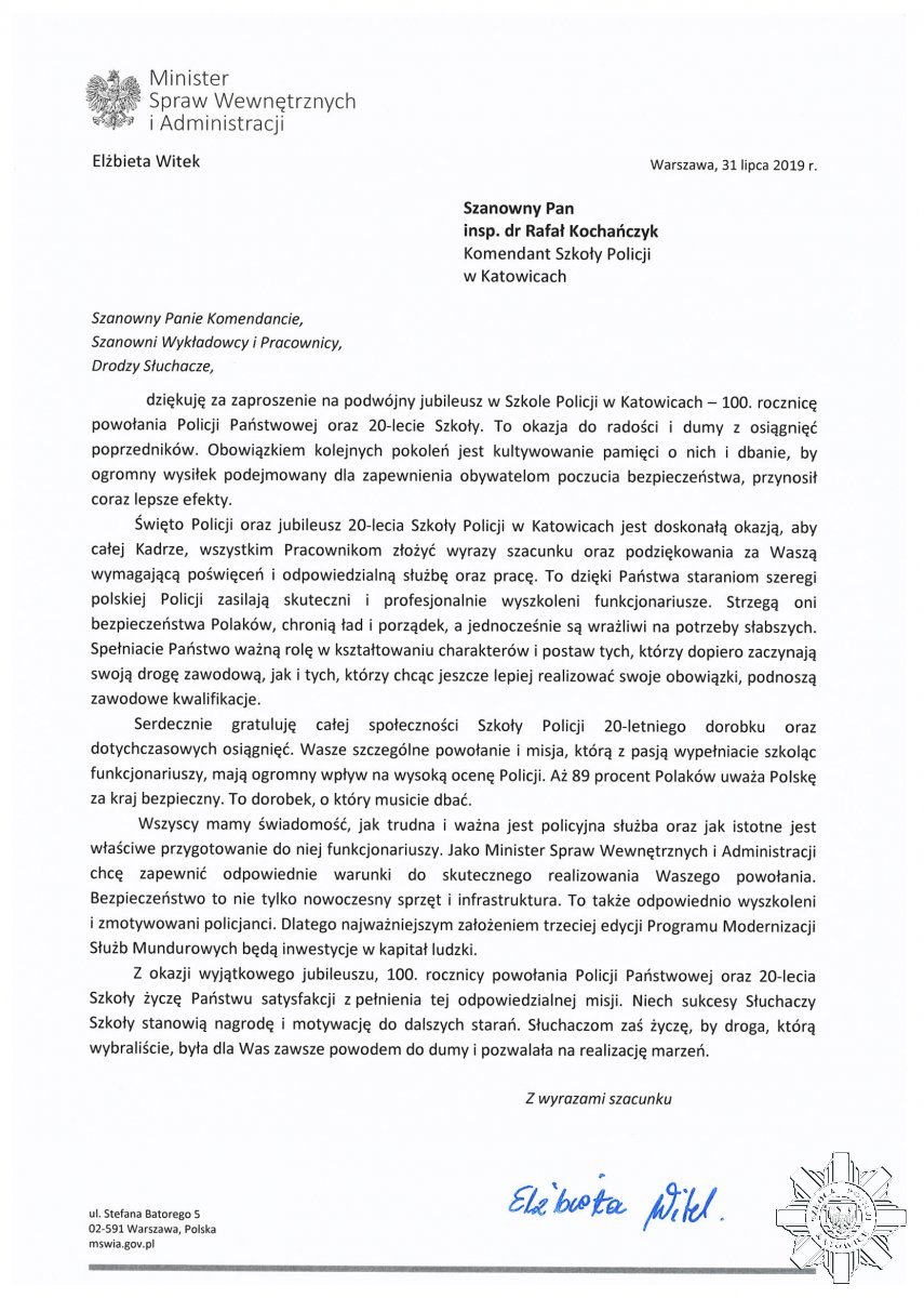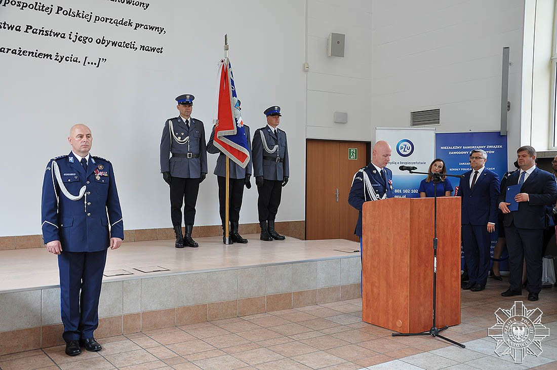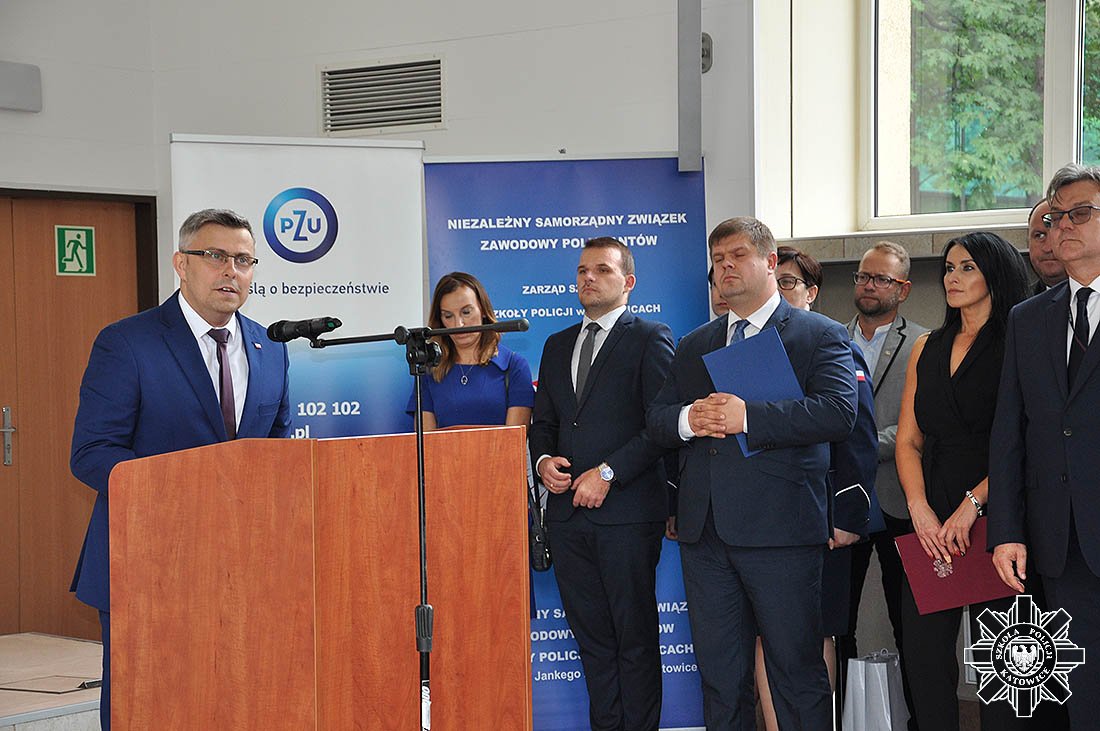 Następnie Komendant Szkoły Policji w Katowicach insp. dr Rafał Kochańczyk serdecznie przywitał przybyłych gości, przekazał wszystkim policjantom i pracownikom podziękowania za trud jaki wkładają w codzienną służbę i pracę oraz złożył życzenia wielu sukcesów i pomyślności zarówno dla nich, jak i ich rodzin. Po przemówieniu przedstawiciel Biura Bezpieczeństwa Narodowego Bogusław Cichoń odczytał list Prezydenta Rzeczypospolitej Polskiej Andrzeja Dudy skierowany do kierownictwa i pracowników Szkoły Policji w Katowicach.