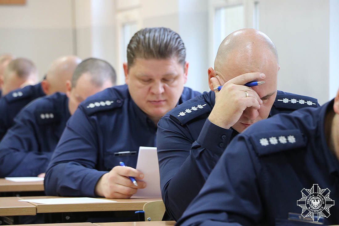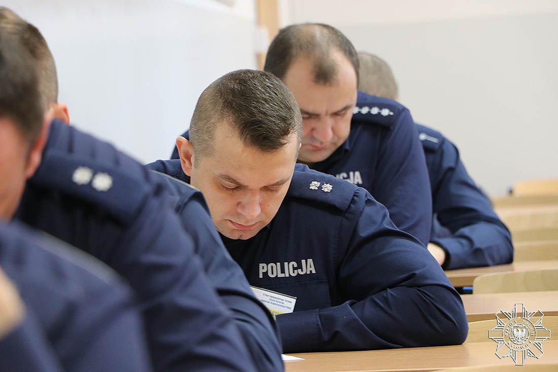 Uczestnicy konkursu zmagali się dzisiaj z testem wiedzy policyjnej, który obejmuje problematykę z zakresu działania policjantów pełniących służbę na stanowisku kierowania jednostek organizacyjnych Policji, w szczególności: