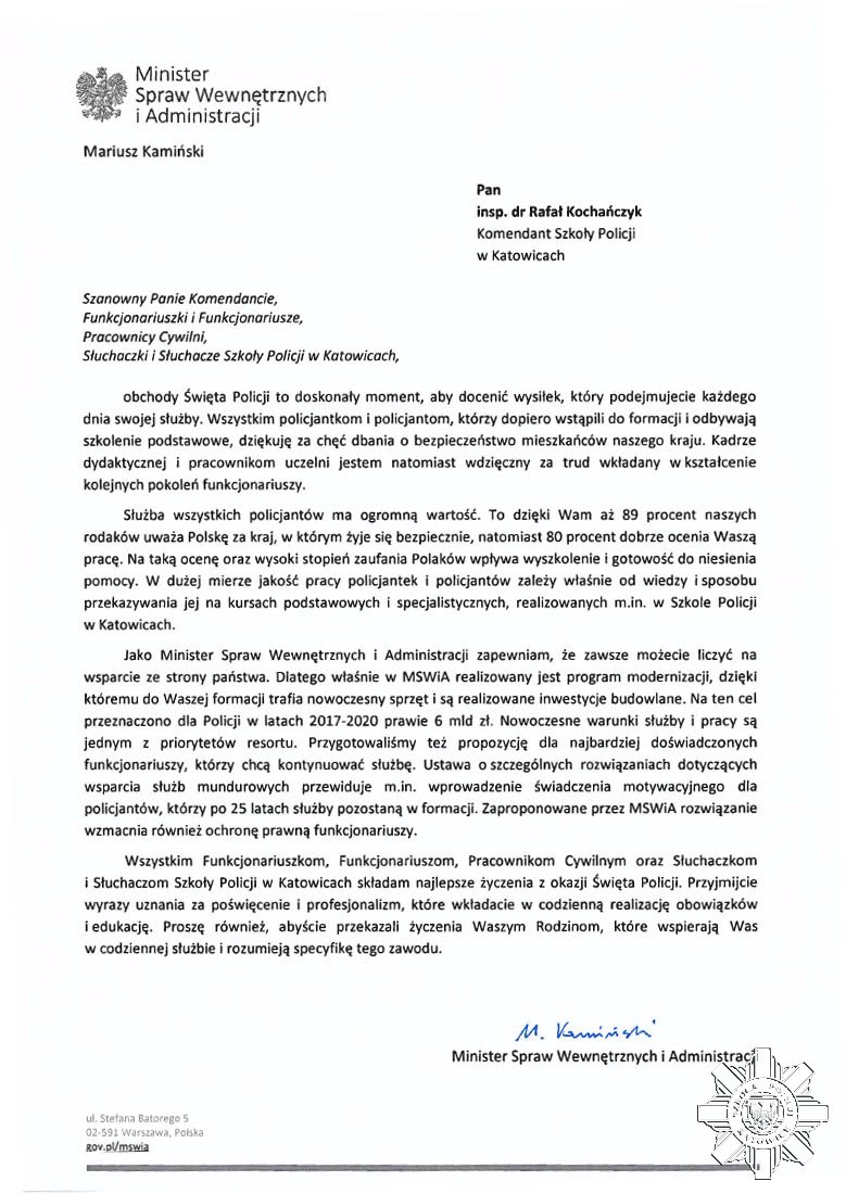 Komendant Szkoły Policji w Katowicach insp. dr Rafał Kochańczyk przekazał wszystkim policjantom i pracownikom podziękowania za trud jaki wkładają w codzienną służbę i pracę oraz złożył życzenia wielu sukcesów i pomyślności zarówno dla nich, jak i ich rodzin. Następnie wręczył akty mianowania na wyższy stopień policyjny i odznaczenia. W trakcie dzisiejszego apelu Komendant złożył również wieniec przy tablicy epitafijnej policjantów zamordowanych przez NKWD.